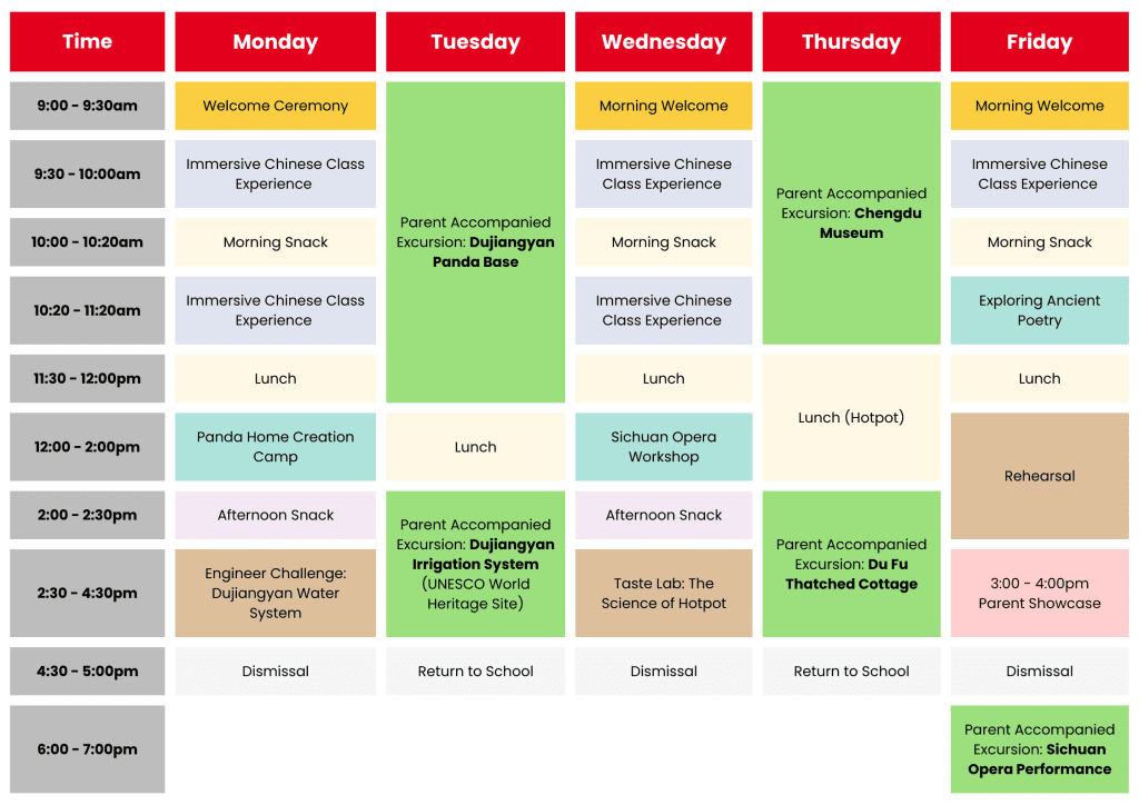 This sample timetable showcases a 5-day week of full Mandarin immersion, where children learn, explore, and play alongside their peers in school. Mornings are devoted to art, science, and music exploration, as well as inquiry, while afternoons are filled with cultural craft workshops and outdoor adventures.