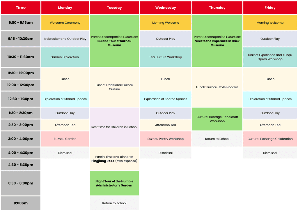 This sample timetable showcases a 5-day week of full Mandarin immersion, where children learn, explore, and play alongside their peers in school. Mornings are devoted to core skills through stories, games, and inquiry, while afternoons are filled with creative science workshops and outdoor adventures.