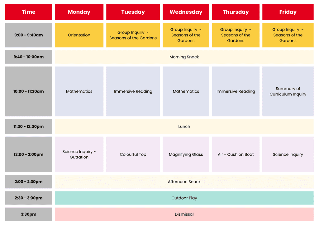 This sample timetable highlights a week of full Mandarin immersion where children learn, explore, and play entirely in Mandarin. Each day weaves together rich language exposure and hands-on discovery, ensuring children hear, speak, and experience Mandarin naturally as they learn. Mornings focus on core skills like Mathematics and Immersive Reading, brought to life through stories, games, and inquiry-based experiences. Afternoons open into creative science workshops and outdoor adventures. Every moment becomes a natural and joyful opportunity to use Mandarin.