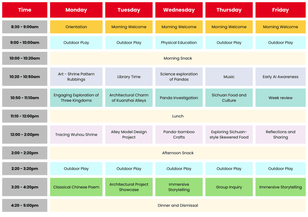 This sample timetable showcases a week of full Mandarin immersion, where children learn, explore, and play in Mandarin. Mornings are devoted to core skills through stories, games, and inquiry, while afternoons are filled with creative science workshops and outdoor adventures.