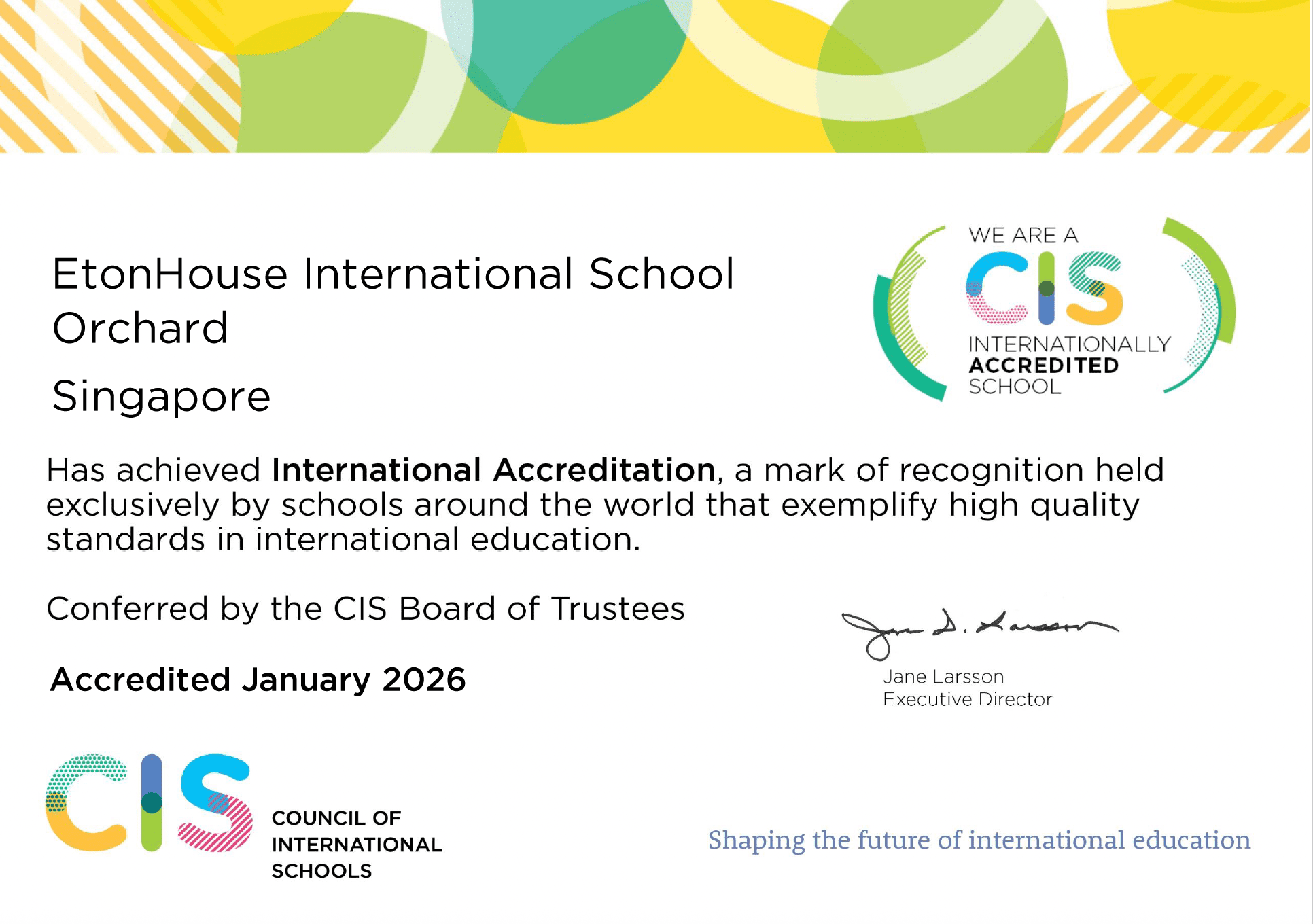 EtonHouse International School Orchard is proud to announce that it has achieved CIS (Council of International Schools) Accreditation. This important milestone reflects the school’s strong educational provision and its deep commitment to student wellbeing, high-quality teaching and learning, and continuous improvement. CIS accreditation is a rigorous and reflective process, and this outcome affirms the strength of the school’s vision, leadership, and community.